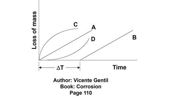 Curve B - Similar to A, except that there is an induction period which is related to the time spent by the corrosive agent to destroy previously existing protective films.